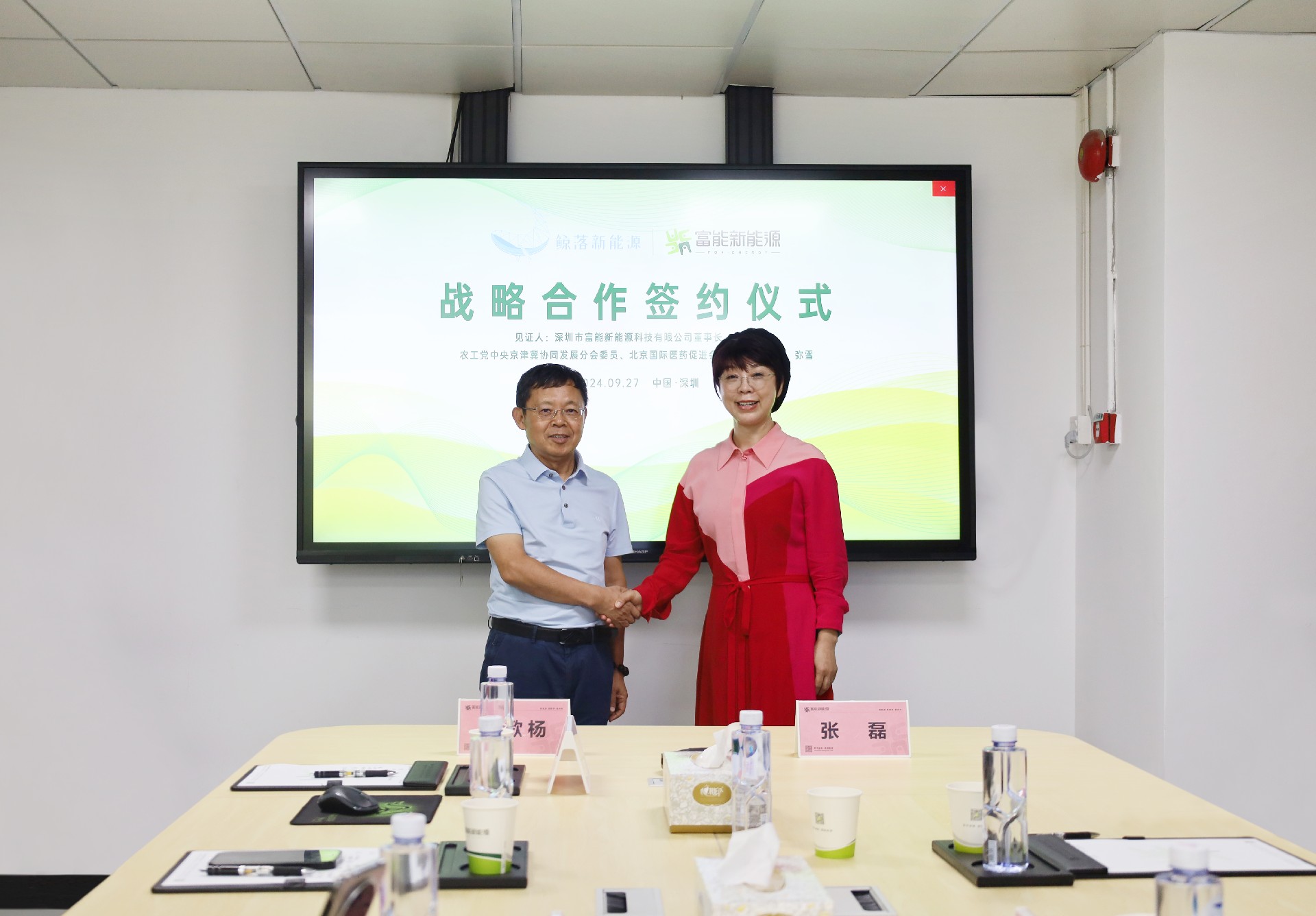 2024年9月27日,在深圳市富能新能源科技有限公司董事長莊春源、農工黨中央京津冀協(xié)同發(fā)展分會委員、北京國際醫(yī)藥促進會副會長兼秘書長彌雪的共同見證下,由富能執(zhí)行副總宋歌楊和鯨落新能源董事長張磊代表雙方共同簽署戰(zhàn)略合作協(xié)議。